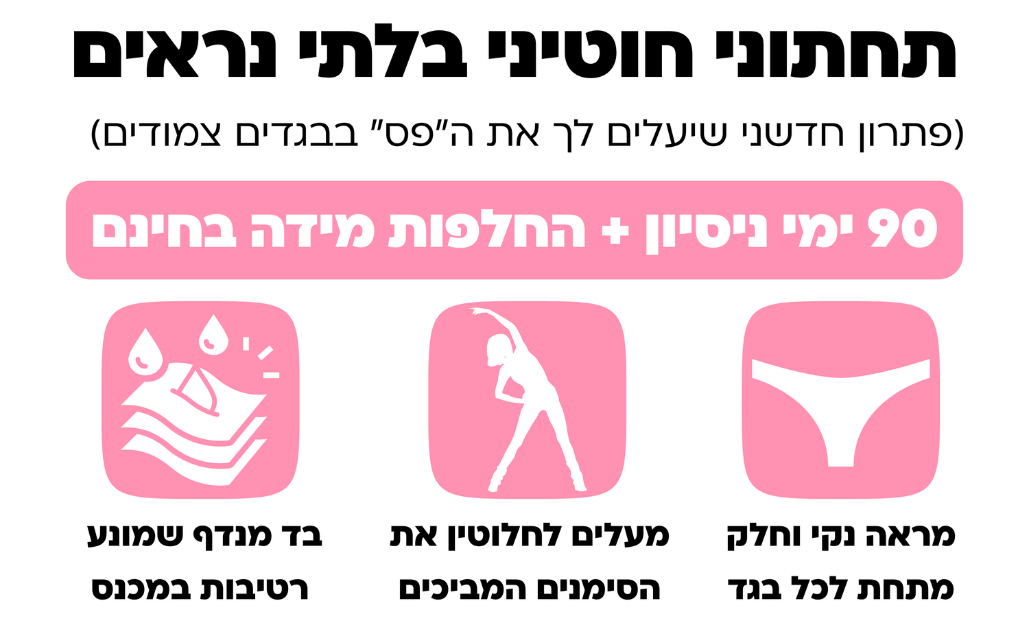 התחתון שלנו כולל רפידה נושמת ורכה, שנתפרת במדויק אל אזור המפשעה, כך שהיא נשארת במקום, לא זזה בזמן פעילות, ומונעת לחלוטין הופעה של "פס" מביך או תחושת לחות באזור.